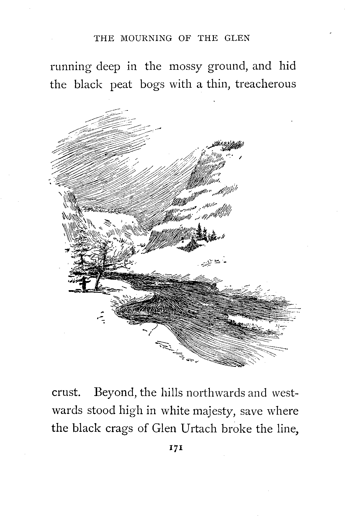 On Friday morning the wind had sunk to passing gusts that powdered your coat with white, and the sun was shining on one of those winter landscapes no townsman can imagine and no countryman ever forgets. The Glen, from end to end and side to side, was clothed in a glistering mantle white as no fuller on earth could white it, that flung its skirts over the clumps of trees and scattered farmhouses, and was only divided where the Tochty ran with black, swollen stream. The great moor rose and fell in swelling billows of snow that arched themselves over the burns, running deep in the mossy ground, and hid the black peat bogs with a thin, treacherous crust.