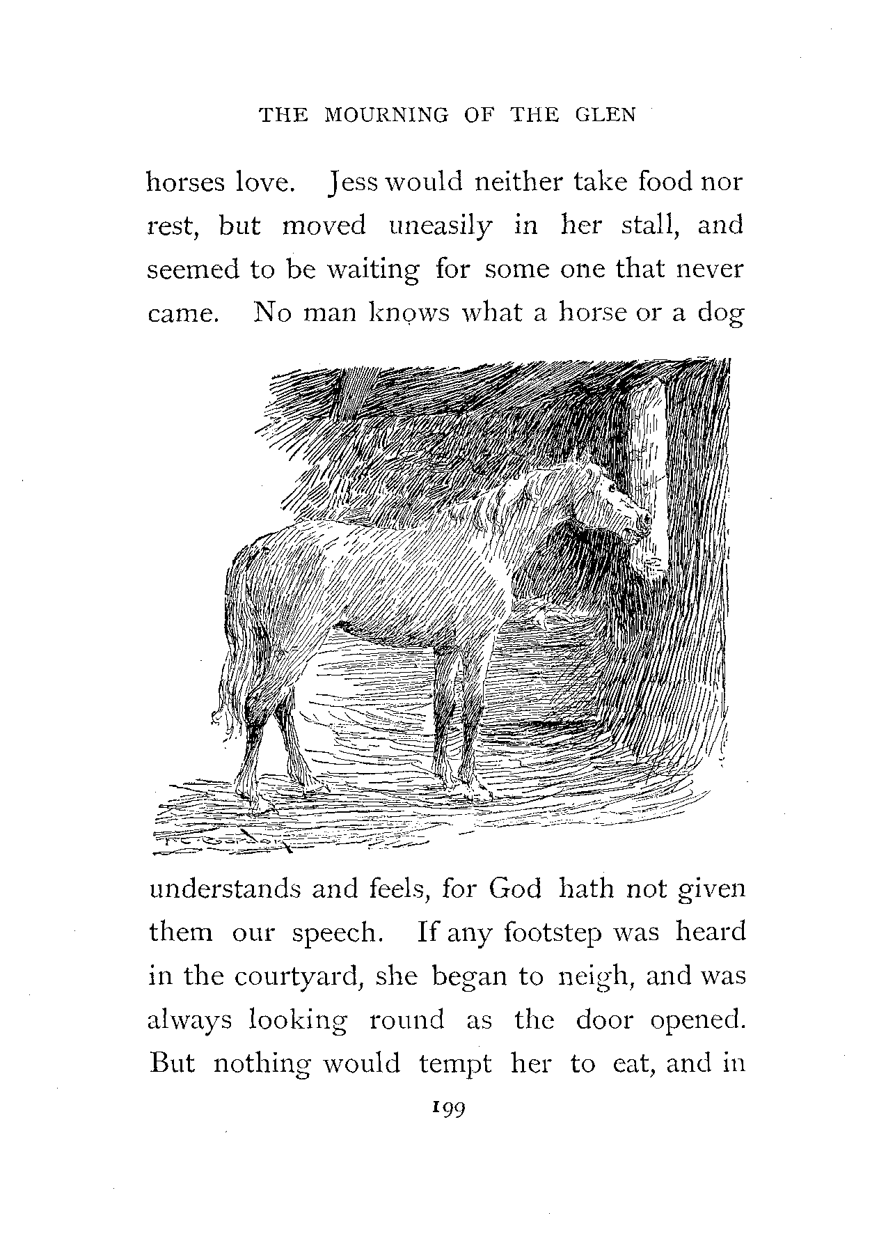 After the funeral Drumsheugh came himself for Jess, and took her to his farm. Saunders made a bed for her with soft, dry straw, and prepared for her supper such things as horses love. Jess would neither take food nor rest, but moved uneasily in her stall, and seemed to be waiting for some one that never came. No man knows what a horse or a dog understands and feels, for God hath not given them our speech. If any footstep was heard in the courtyard, she began to neigh, and was always looking round as the door opened. But nothing would tempt her to eat, and in the night-time Drumsheugh heard her crying as if she expected to be taken out for some sudden journey. The Kildrummie veterinary came to see her, and said that nothing could be done when it happened after this fashion with an old horse.