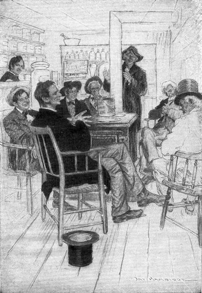 “When he got home he’d come right in here first time he was downtown and tell me every blamed yarn he’d heard. Whole crowd would get in here sometimes and talk over the trip, and I tell you it was something to hear ’em laugh. You could tell how Lincoln kept things stirred up. He was so blamed quick. Ever hear Judge Weldon tell that story about what Lincoln said one day up to Bloomington when they was takin’ up a subscription to buy Jim Wheeler a new pair of pants? No? Well, perhaps I oughten to tell it to you, ma says it ain’t nice. It makes me mad to hear people objectin’ to Mr. Lincoln’s stories. Mebbe he did say words you wouldn’t expect to hear at a church supper, but he never put no meanin’ into ’em that wouldn’t ’a’ been fit for[8] the minister to put into a sermon, and that’s a blamed sight more’n you can say of a lot of stories I’ve heard some of the people tell who stick up their noses at Mr. Lincoln’s yarns.