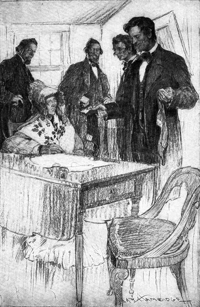 “No end of other great men around. He saw ’em all. Sometimes I used to step over and watch him—didn’t bother him[16] a mite to see a big man—not a mite. He’d jest shake hands and talk as easy and natural as if ’twas me—and he didn’t do no struttin’ either. Some of the fellers who come to see him looked as if they was goin’ to be president, but Mr. Lincoln didn’t put on any airs. No, sir, and he didn’t cut any of his old friends either. Tickled to death to see ’em every time, and they all come—blamed if every old man and woman in Sangamon County didn’t trot up here to see him. They’d all knowed him when he was keepin’ store down to New Salem and swingin’ a chain—surveyed lots of their towns for ’em—he had—and then he’d electioneered all over that county, too, so they just come in droves to bid him good-by. I was over there one day when old Aunt Sally Lowdy came in the door. Aunt Sally lived down near New Salem,[17] and I expect she’d mended Mr. Lincoln’s pants many a time; for all them old women down there just doted on him and took care of him as if he was their own boy. Well, Aunt Sally stood lookin’ kind a scared seein’ so many strangers and not knowin’ precisely what to do, when Mr. Lincoln spied her. Quick as a wink he said, ‘Excuse me, gentlemen,’ and he just rushed over to that old woman and shook hands with both of his’n and says, ‘Now, Aunt Sally, this is real kind of you to come and see me. How are you and how’s Jake?’ (Jake was her boy.) ‘Come right over here,’ and he led her over, as if she was the biggest lady in Illinois, and says, ‘Gentlemen, this is a good old friend of mine. She can make the best flapjacks you ever tasted, and she’s baked ’em for me many a time.’ Aunt Sally was jest as pink as a rosy, she was so tickled. And[18] she says, ‘Abe’—all the old folks in Sangamon called him Abe. They knowed him as a boy, but don’t you believe anybody ever did up here. No, sir, we said Mr. Lincoln. He was like one of us, but he wa’n’t no man to be over familiar with. ‘Abe,’ says Aunt Sally, ‘I had to come and say good-by. They say down our way they’re goin’ to kill you if they get you down to Washington, but I don’t believe it. I just tell ’em you’re too smart to let ’em git ahead of you that way. I thought I’d come and bring you a present, knit ’em myself,’ and I’ll be blamed if that old lady didn’t pull out a great big pair of yarn socks and hand ’em to Mr. Lincoln.