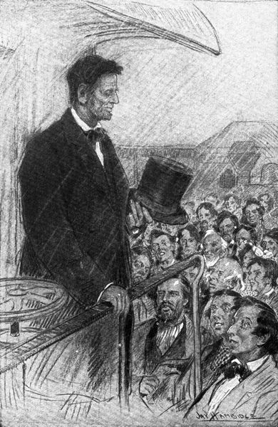 “He stood a minute lookin’ at us, and then he began to talk. There ain’t a man in this town that heard him that ever forgot what he said, but I don’t believe there’s a man that ever said it over out loud—he couldn’t, without cryin’. He just talked to us that time out of his heart. Somehow we felt all of a suddint how we[24] loved him and how he loved us. We hadn’t taken any stock in all that talk about his bein’ killed, but when he said he was goin’ away not knowin’ where or whether ever he would return I just got cold all over. I begun to see that minute and everybody did. The women all fell to sobbin’ and a kind of groan went up, and when he asked us to pray for him I don’t believe that there was a man in that crowd, whether he ever went to church in his life, that didn’t want to drop right down on his marrow bones and ask the Lord to take care of Abraham Lincoln and bring him back to us, where he belonged.