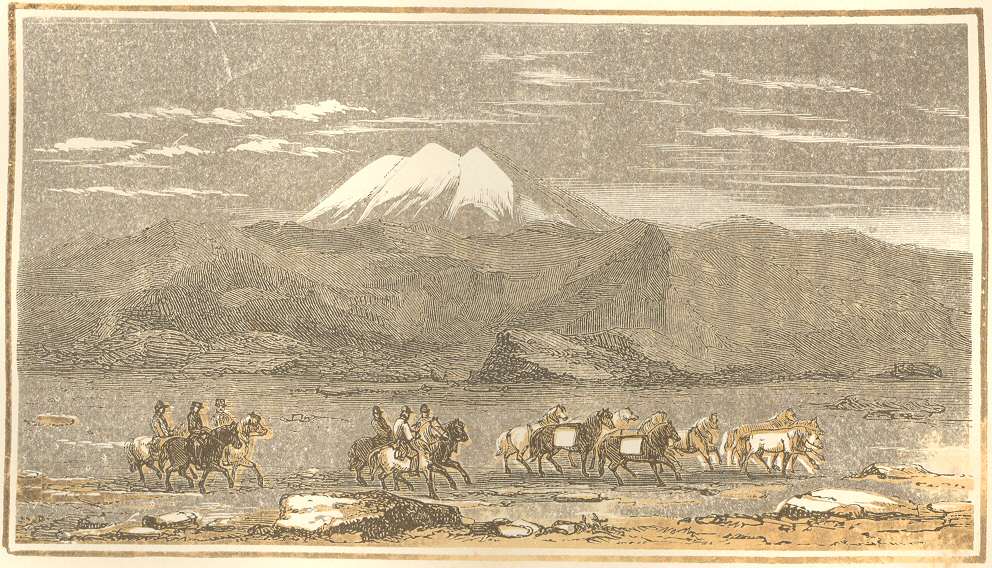 [33] An American travelling in Iceland in 1852 thus describes, in a letter to the Boston Post, the mode of travelling:—“All travel is on horseback. Immense numbers of horses are raised in the country, and they are exceedingly cheap. As for travelling on foot, even short journeys, no one ever thinks of it. The roads are so bad for walking, and generally so good for riding that shoe-leather, to say nothing of fatigue, would cost nearly as much as horse-flesh. Their horses are small, compact, hardy little animals, a size larger than Shetland ponies, but rarely exceeding from 12 or 13½ hands high. A stranger in travelling must always have a ‘guide,’ and if he does go equipped for a good journey and intends to make good speed, he wants as many as six horses; one for himself, one for the guide, one for the luggage, and three relay horses. Then when one set of horses are tired the saddles are exchanged to the others. The relay horses are tied together and are either led or driven before the others. A tent is often carried, unless a traveller chooses to chance it for his lodgings. Such an article as an hotel is not kept in Iceland out of the capital. You must also carry your provisions with you, as you will be able to get but little on your route. Plenty of milk can be had, and some fresh-water fish. The luggage is carried in trunks that are hung on each side of the horse, on a rude frame that serves as a pack-saddle. Under this, broad pieces of turf are placed to prevent galling the horse’s back.”