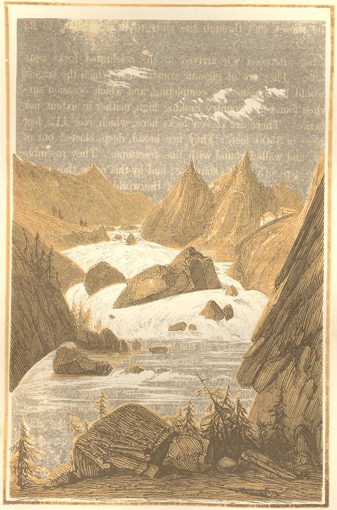 The mountains now become higher and higher, but above them all towers the gigantic Jungfernsprung (Maiden’s Leap). The beauty of this region is only surpassed by the situation of the town and castle of Tetschen. The castle stands on a rock, between twenty and thirty feet high, which seems to rise out of the Elbe; it is surrounded by hot-houses and charming gardens, shelving downwards as far as the town, which lies in a blooming valley, near a little harbour. The valley itself, encompassed by a chain of lofty mountains, seems quite shut out from the rest of the world.