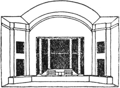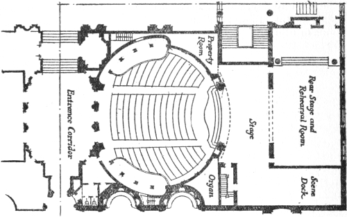 In the theatre, this perpetuation of musty, tradition-hallowed faults of construction has been carried to an extraordinary extreme. There is more ritual, one might believe, in constructing a stage and auditorium in accordance with honored custom than there is in the building of a church. In the more modern theatres, there have been notable improvements over the theatres of a generation ago; but in the auditoriums and stages of schools, clubs and societies, and in other public or semi-public buildings in which such facilities are included as a sort of side issue, the ancient law is observed. The average high school stage seems to be inspired by the faint recollection of a visit to the theatre, supplemented by the examination of old prints illustrating the stage of Inigo Jones.