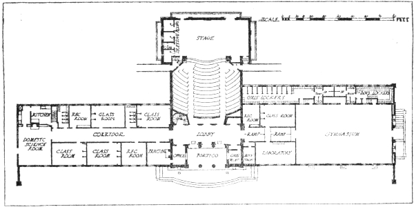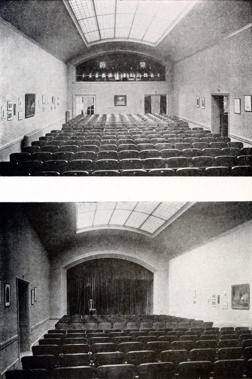There are, of course, other types of auditorium and platform than that of the theatre. Churches, lecture halls, and the chambers of legislative assemblies are planned with the same general end of making a person or persons at one part of the room audible and visible to many persons gathered in another part. The ready defense of much bad planning in school auditoriums is that they were not modelled after theatres but after one of these other forms. To-day this will not serve as a defense. Interest in the drama is too widespread, and recognition of the social potency of the theatre is too general. And whereas none of these other forms of audience chamber meets the needs of the theatre, a well-planned theatre can serve any use to which a gathered community may care to put it.