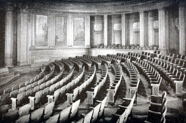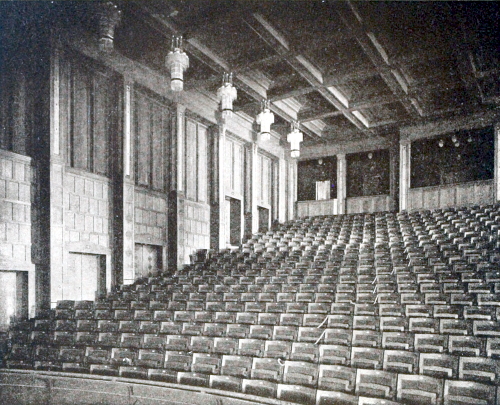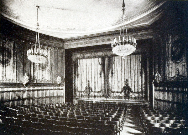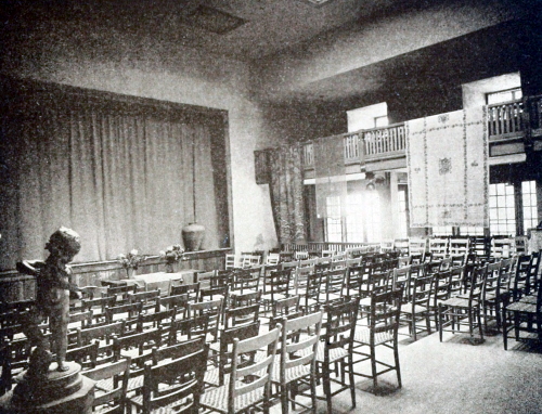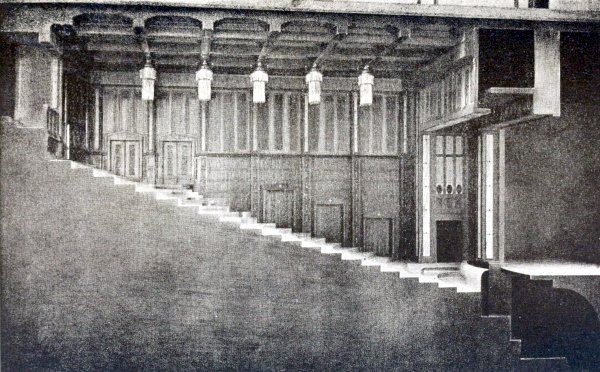 The rocks which threaten disaster to our intent to devise a room which may serve as theatre, assembly hall, chapel, or whatever, are, if we go to beginnings, the traditional form of the theatre and its traditional décor. In the latter, time has wrought many changes. It was once felt that a theatre was not a theatre if it was not adorned with a wealth of gilded cupids, masks, tambours, and daggers, surrounded by stucco wreaths and garlands in high relief, and interspaced with pictured panels of the muses, especially those most at home in a playhouse. And, indeed, about those old houses, their garishness now mellowed, there is a glamor peculiarly of the theatre, and a sweet mustiness in the air bespeaking audiences of perfumed ladies, long since dead, the grease-paint and pomade of a long line of players, old scenery, the fine fustian of the old plays. It is somewhat like the odor in a garret stored with the treasures of our grandparents, or the mustiness of an old book. But these are faded flowers that cannot be brought to life, and the theatre of to-day, its plays and its players, are moved by a different spirit. Whatever lure these tinselly old temples have is a reminiscent one. To-day, there may be found theatres with the simplicity and peace of a church, the unobtrusive luxury of the drawing-room, and even, by overshooting the mark of simplicity, the bareness of the lecture-room or the legislative chamber.