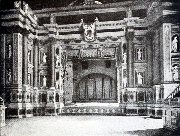 The theatre of the Academy of Olympians at Vicenza, begun in 1580 by the architect Palladio and completed in 1584 by his son Scillo (Fig. 1), is practically a Roman theatre roofed over, and equipped with a stage that compromises with the stage then in mode. It has a sloping floor (to increase the effect of the perspective) and alleys of scenery giving off each entranceway in the stage wall.