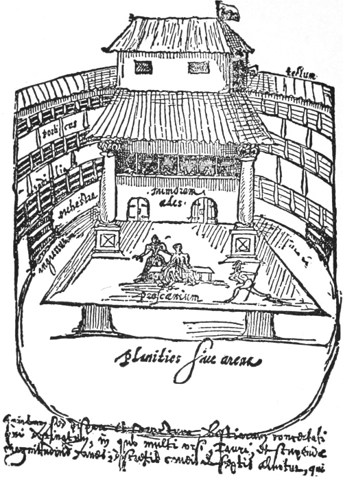 The earliest theatres, built about 1576, were round in shape, with these characteristic galleries. They seem to have been used interchangeably for theatrical performances and for bear-baiting. The centers were open to the sky, like the inn-yards, and only the galleries and part of the stage were roofed. The stages projected into the center, and could be viewed, both by spectators on the ground and by those in the galleries, from three sides. The only contemporary drawing of the Elizabethan stage is that of Johannes De Witt of the University of Utrecht, who visited London in 1596. His drawing of the Swan Theatre differs in many details from the specifications of the contract, but it gives a general idea of the form of auditorium and stage. With the building of these theatres,—The Theatre, The Curtain, The Hope, The Globe, Blackfriar’s, The Swan,—the use of the inn-yards did not cease, and the Queen’s men performed regularly at The Boar’s Head in Eastcheap as late as 1603.[3]