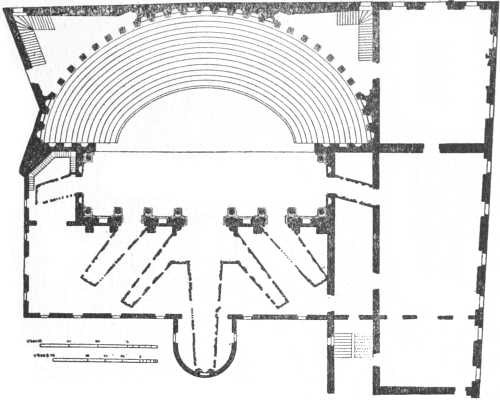 Between the fall of the Roman Empire and the revival of classic learning in Italy, the theatre had no settled home. The drama went through various vicissitudes, took on new functions, expressed itself in new forms. The mediæval theatre of mysteries and miracles, after it had become secularized, went forth from the chancel of the church, and became a vagrant and an opportunist. It set up its paraphernalia in the public square, in the inn-yard, in the guild hall. For the most part, it was a daylight, outdoor recreation, with no fixed home, and no such special ceremonial functions as in the Greek and Roman state. It was proletarian, distinctly. With the Renaissance, in addition to the popular itinerant theatre of the people, there were two new manifestations. The humanists, in their academies, revived the Roman comedies of Plautus and Terence; the courts of the ruling families of the free cities became the scenes of magnificent productions of masques, pageants, “triumphs” and fêtes. These were usually allegories based on classic mythology or on ancient history, but presented largely in the form and manner of the popular drama of the time. To the presentation of the court fêtes, the greatest artists,—Bramante, Leonardo da Vinci, Giulio Romano, etc.,—brought their talents. They were given in the gardens of the palaces at night, illuminated by flares and fireworks. The “pageant” or wheeled stage of the mediæval popular[Pg 18] drama, was used for the display of some large piece of decoration or machinery. As early as 1491, however, at Perugia, the first indoor performances were given. The stage went through various modifications, still keeping its resemblance to the stage of the mediæval drama, until one invention enforced the most radical development that had yet taken place,—perspective scenery. Hammitzsch[2] traces the invention of scenery in painted perspective to Bramante’s decoration of the sacristy of the Church of San Satiro in Milan. The wall painting represents in perspective an extended vista of the sacristy, in an attempt to make it appear larger. The modern counterpart is the mirrored restaurant. It is certain, at all events, that Peruzzi employed such scenery in dramatic representations in Rome before 1510. With these painted prospects came a variety of changes in the arrangements of the rooms in which the masques were given; the stage became more a place apart; it was set at the end of the room rather than along the sides, that the effect of distance produced by the painted prospects might be enhanced, and the proscenium frame enclosed it. However, when the theatre as a building designed specifically for the presentation of plays came into being, the form of auditorium was not so thoughtfully adapted to this new type of stage as had been the case with the ancient theatres. For it was to them that architects turned for models for the auditorium, though the stage was no longer the stage that went with the amphitheatre form of seating.