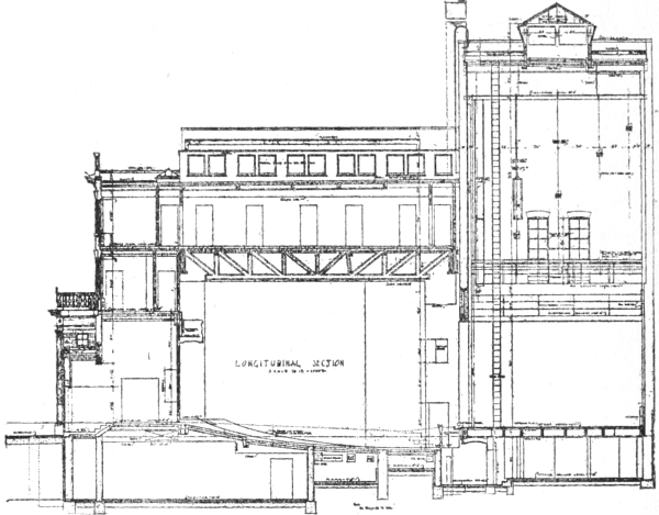 Figure 3—Above is the section of the Little Theatre, New York, showing clearly the relationship of the stage, auditorium and other portions of the building. The dressing-rooms are above the auditorium and are reached by both stairs and elevator. On the opposite page is the first-floor plan of the building. It is a notable example of the best contemporary American practice in auditorium arrangement. These drawings illustrate the building as originally constructed, without the recently added balcony and other changes. Harry Creighton Ingalls and F. B. Hoffman Jr., Associate Architects.