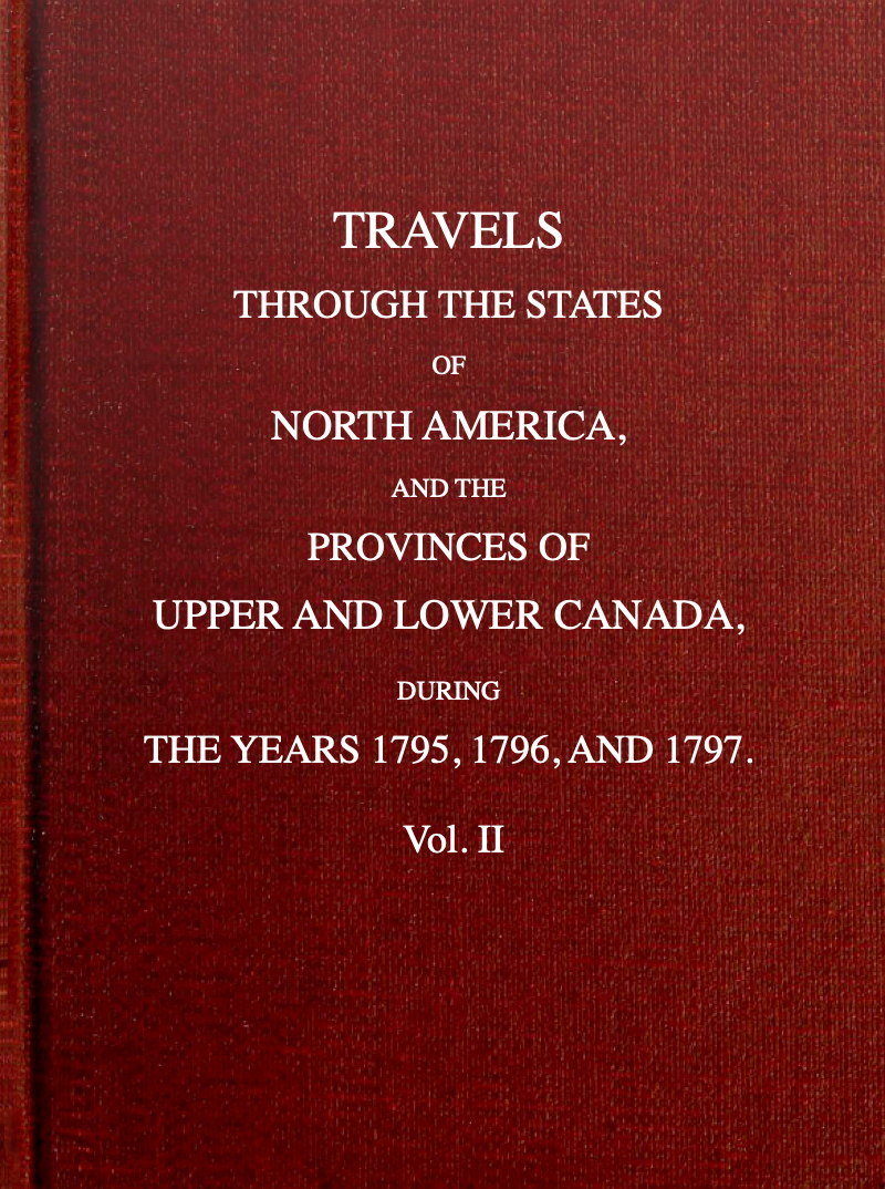 | The Party make the usual Preparations for ascending the St. Lawrence.—Buffalo Skins.—How used by Travellers.—Difficulty of proceeding to Lake Ontario otherwise than by Water.—Rapids above Montreal.— Village of La Chine.—King’s Stores there.—Indian Village on the opposite Side of the River.—Similitude between French Canadians and Indians in Person and Disposition of Mind.—Owing to this the Power of the French over the Indians.—Summary View of the Indians in Lower Canada.—The Party embark in a Bateau at La Chine.—Mode of conducting Bateaux against a strong Current.—Great Exertion requisite—Canadians addicted to smoking.—How they measure Distances.—Description of Lake St. Louis.—Clouds of Insects over Reed Banks.—Party encamps on l’Isle Perot.—Passage of Rapids called Les Cascades—Their tremendous Appearance.—Description of the Village of the Hill of Cedars.—Rapids du Coteau du Lac.—Wonderful Rapidity of the Current.—Party encamps.—Lake St. Francis.—Point au Baudet.—L’Isle aux Raisins.—Island in the River still the Property of the Indians.—Not determined yet whether in the British Territory or that of the States.—Party encamps.—Storm.—Unpleasant Situation of the Party.—Relieved.—Continue the Voyage.—Account of more Rapids.—Canals and Locks at different Places on the River St. Lawrence.—Immense Flights of Pigeons.—Emigration of Squirrels and Bears.—Oswegatchee River and Fort la Galette described.—Advantageous Position of the latter.—Current above this gentle.—Bateaux sail on all Night.—Songs of the Canadians.—Good Ear for Music.—Lake of a Thousand Isles.—Arrival at Kingston on Lake Ontario.—Observations on the Navigation of the St. Lawrence.—The St. Lawrence compared with the Mississippi.—A View of the different Rivers which open a Water Communication between the Great Lakes and the Atlantic.—Great Superiority of the St. Lawrence over all the rest.—Of the Lake Trade. | page 19 |