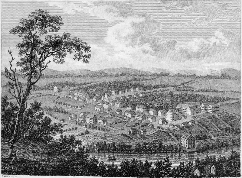 Bethlehem is the principal settlement, in North America, of the Moravians, or United Brethren. It is most agreeably situated on a rising ground, bounded on one side by the river Leheigh, which falls into the Delaware, and on the other by a creek, which has a very rapid current, and affords excellent seats for a great number of mills. The town is regularly laid out, and contains about eighty strong built stone dwelling houses and a large church. Three of the dwelling houses are very spacious buildings, and are appropriated respectively to the accommodation of the unmarried young men of the society, of the unmarried females, and of the widows. In these houses different manufactures are carried on, and the inmates of each are subject to a discipline approaching somewhat to that of a monastic institution. They eat together in a refectory; they sleep in dormitories; they attend morning and evening prayers in the chapel of the house; they work for a certain number of hours in the day; and they have stated intervals allotted to them for recreation. They are not subjected, by the rules of the society, to perpetual confinement; 358but they seldom, notwithstanding, go beyond the bounds of their walks and gardens, except it be occasionally to visit their friends in the town.