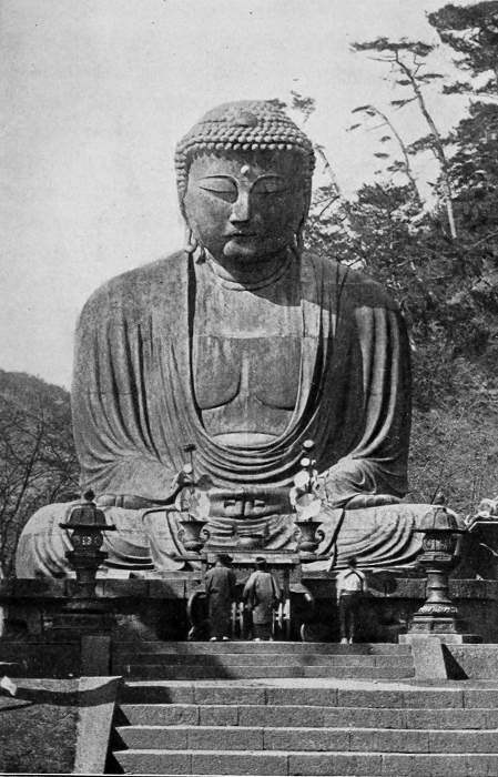 Notwithstanding the changes of recent years, the picturesque and enchanting Old Japan that men of letters have written about so delightfully still survives in many ways. The enormous bronze Buddha at Kamakura sits calmly looking down upon us, as always. At Nikko the avenue of cryptomerias is still wonderfully fine, while the huge blocks of stone in the long flights of steps on the wooded mountain-side bring up a vision of the armies of coolies who placed them there to remain through the ages. The bronze tombs are the same, only more beautifully coloured with age, and the wood-carving and lacquers of the glorious old temples have been kept bright and new by faithful, loving hands. The Inland Sea is just as mysterious and ever-changing, while Fuji is worshipped to-day as it has been since the beginning of all time.