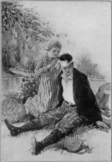 The girl eased him down then upon the sward, and, seating herself beside him, unrolled the apron she had carried.