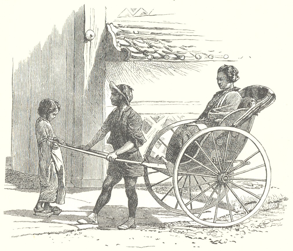 [5] I continue hereafter to use the Japanese word kuruma instead of the Chinese word Jin-ri-ki-sha. Kuruma, literally a wheel or vehicle, is the word commonly used by the Jin-ri-ki-sha men and other Japanese for the “man-power-carriage,” and is certainly more euphonious. From kuruma naturally comes kurumaya for the kuruma runner.