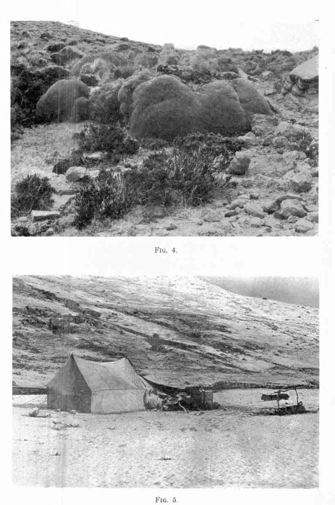 Fig. 4—Large ground moss--so-called yareta--used for fuel. It occurs in the zone of Alpine vegetation and is best developed in regions where the snowline is highest. The photograph represents a typical occurrence between Cotahuasi and Salamanca, elevation 16,000 feet (4,880 m.). The snowline is here at 17,500 feet (5,333 m.). In the foreground is the most widely distributed tola bush, also used for fuel.