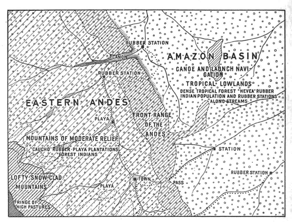 One of them I met at a rubber station on the lower Urubamba River.[1] He helped secure my canoe, escorted me hospitably to his hut, set food and drink before me, and talked of the tropical forest, the rubber business, the Indians, the rivers, and the trails. In his opinion Peru was a land of great forest resources. Moreover, the fertile plains along the river margins might become the sites of rich plantations. The rivers had many fish and his garden needed only a little cultivation to produce an abundance of food. Fruit trees grew on every hand. He had recently married the daughter of an Indian chief.