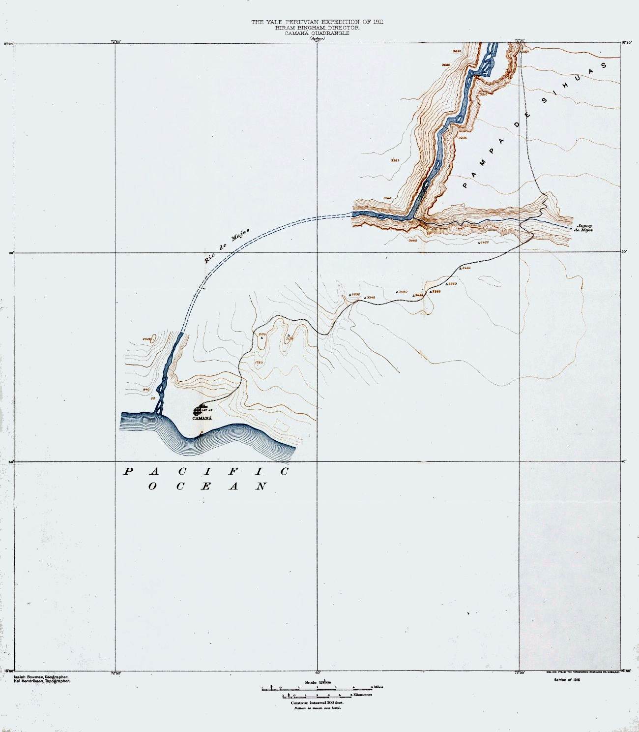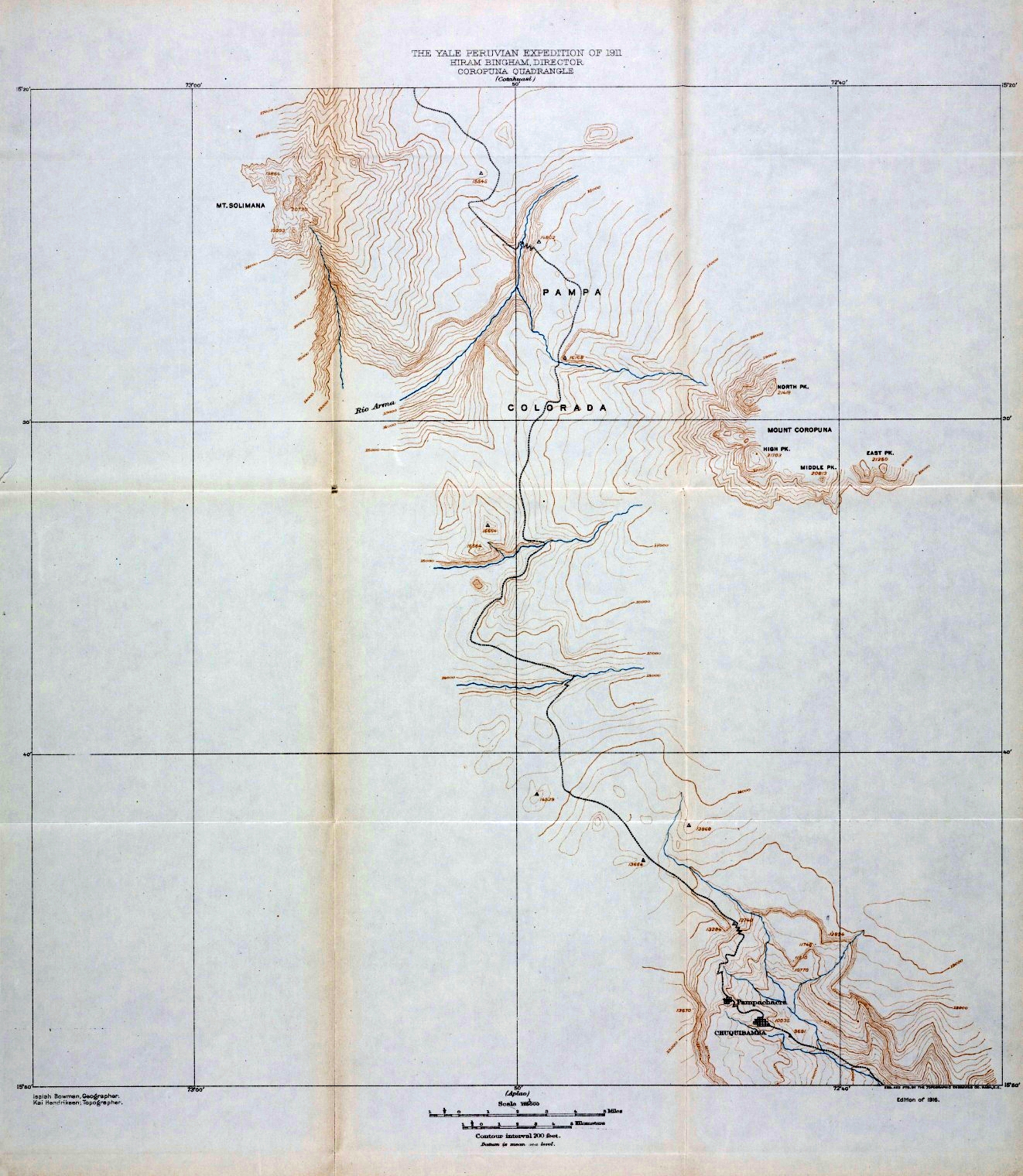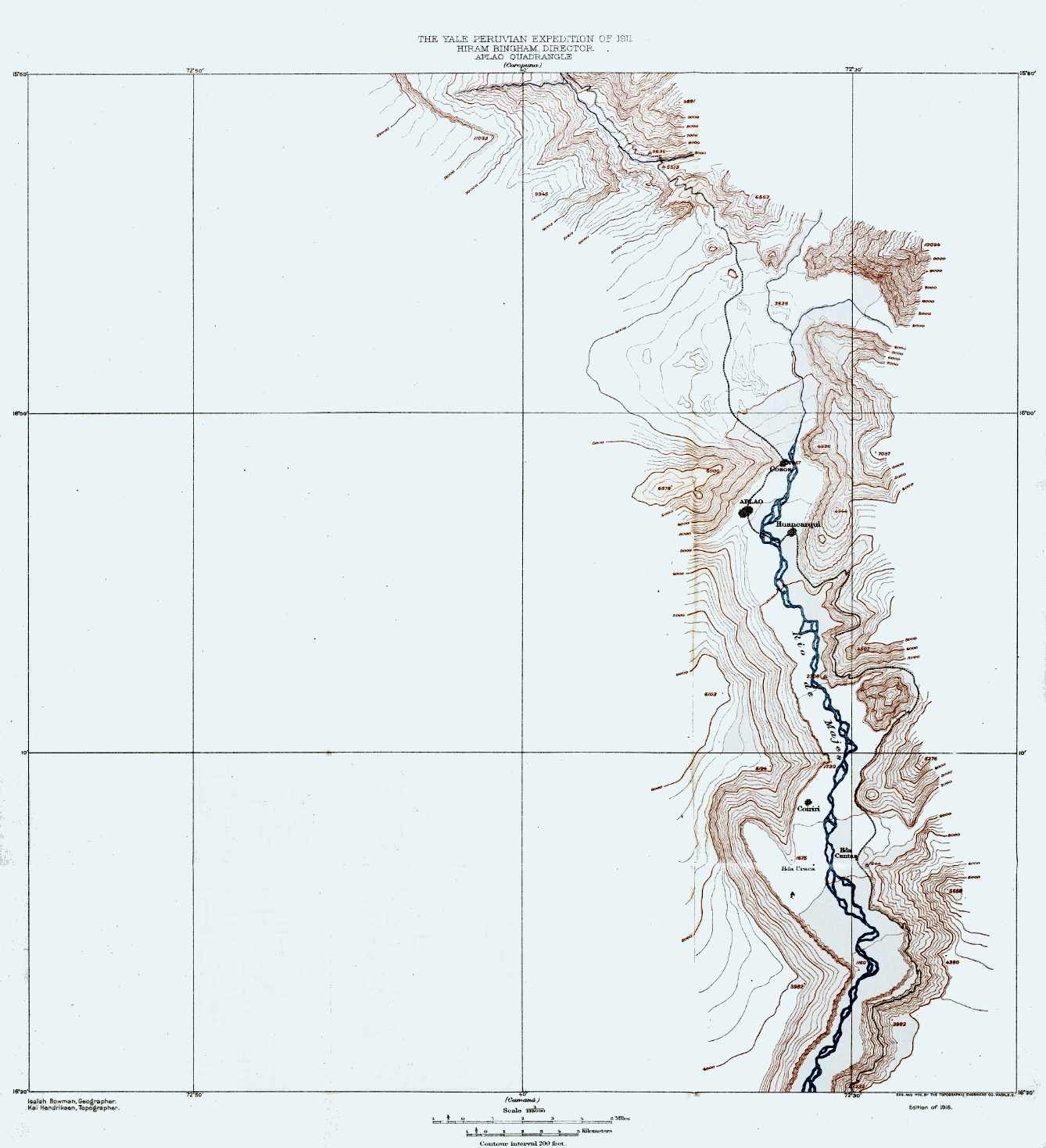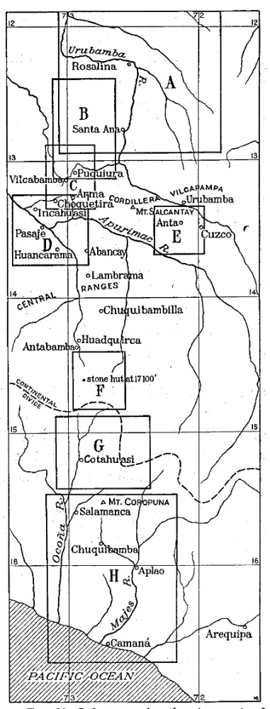 It is also a pleasure to say that Mr. Paul Baxter Lanius, my assistant on the lower Urubamba journey, rendered an invaluable service in securing continuous weather records at Yavero and elsewhere, and in getting food and men to the river party at a critical time. Dr. W. G. Erving, surgeon of the Expedition, accompanied me on a canoe journey through the lower gorge of the Urubamba between Rosalina and the mouth of the Timpia, and again by pack train from Santa Ana to Cotahuasi. For a time he assisted the topographer. It is due to his prompt surgical assistance to various members of the party that the field work was uninterrupted. He was especially useful when two of our river Indians from Pongo de Mainique were accidentally shot. I have since been informed by their patrón that they were at work within a few months.