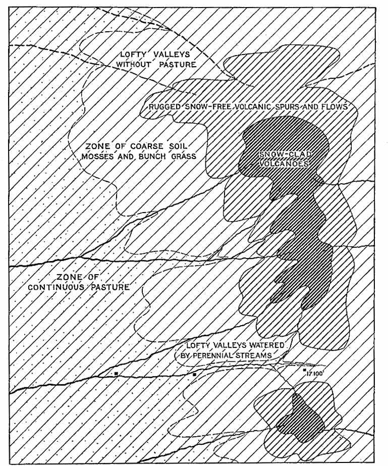 “I live in the deep valley of Cotahuasi, but my lands lie chiefly up here on the plateau. My family has held title to this puna ever since the Wars of Liberation, except for a few years after one of our early revolutions. I travel about a great deal looking after my flocks. Only Indians live up here. Away off yonder beyond that dark gorge is a group of their huts, and on the bright days of summer you may see their sheep, llamas, and alpacas up here, for on the floors of the watered valleys that girdle these volcanoes there are more tender grasses than grow on this despoblado. I give them corn and barley from my irrigated fields in the valley; they give me wool and meat. The alpaca wool is most valuable. It is hard to get, for the alpaca requires short grasses and plenty of water, and you see there is only coarse tufted ichu grass about us, and there are no streams. It is all right for llamas, but alpacas require better forage.