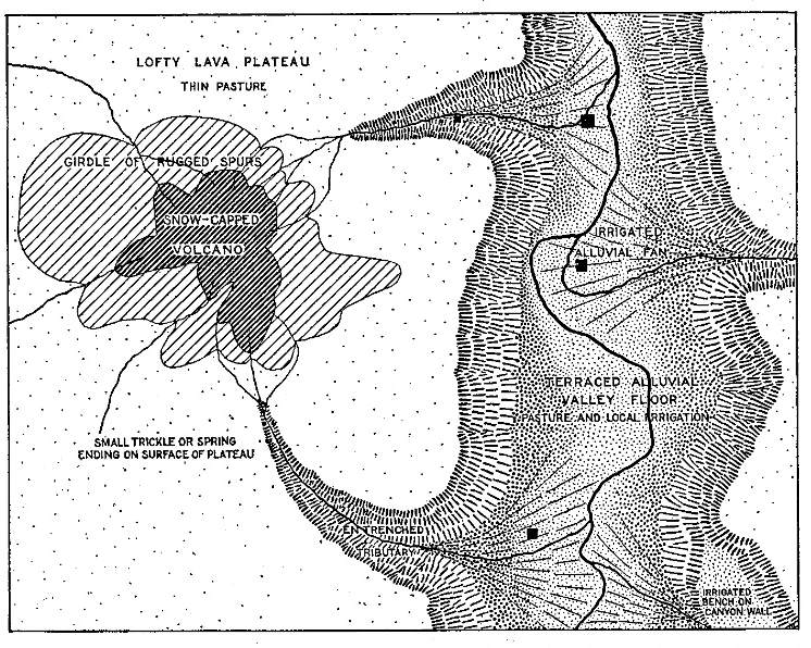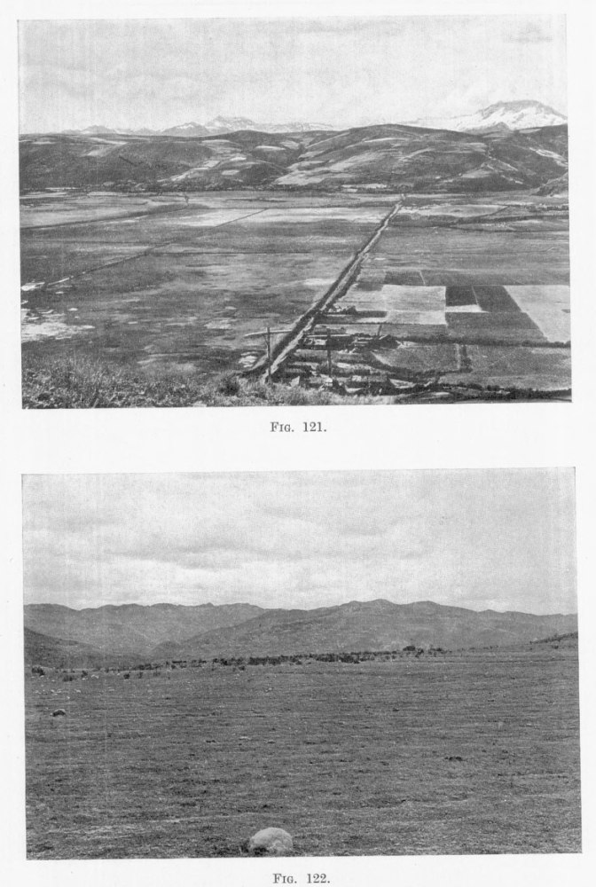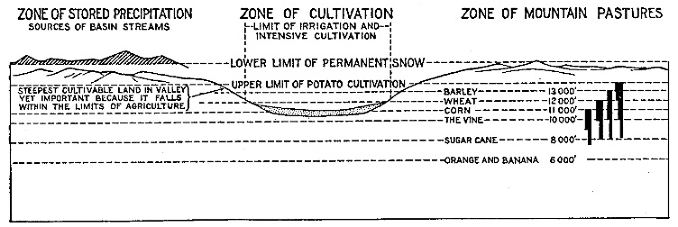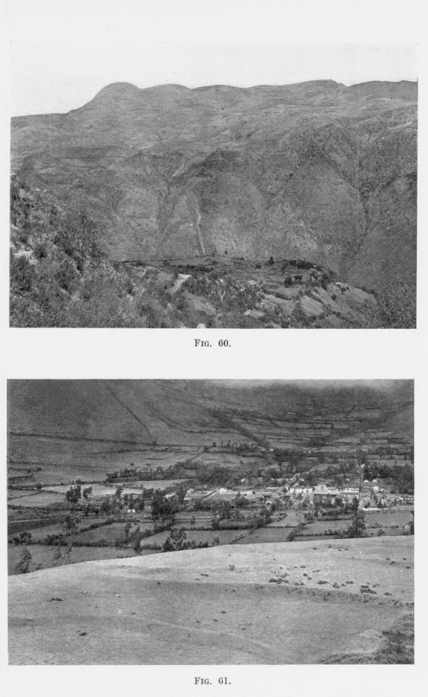 [7] Compare with Raimondi’s description of Quiches on the left bank of the Marañon at an elevation of 9,885 feet (3,013 m.): “the few small springs scarcely suffice for the little patches of alfalfa and other sowings have to depend on the precarious rains.... Every drop of water is carefully guarded and from each spring a series of well-like basins descending in staircase fashion make the most of the scant supply.” (El Departamento de Ancachs, Lima, 1873.)