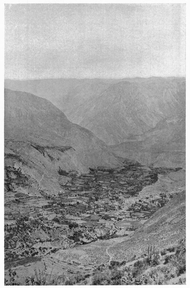 The man from the deep Majes Valley in the coastal desert rode out with me through cotton fields as rich and clean as those of a Texas plantation. He was tall, straight-limbed, and clear-eyed—one of the energetic younger generation, yet with the blood of a proud old family. We forded the river and rode on through vineyards and fig orchards loaded with fruit. His manner became deeply earnest as he pictured the future of Peru, when her people would take advantage of scientific methods and use labor-saving machinery. He said that the methods now in use were medieval, and he pointed to a score of concrete illustrations. Also, here was water running to waste, yet the desert was on either hand. There should be dams and canals. Every drop of water was needed. The population of the valley could be easily doubled.