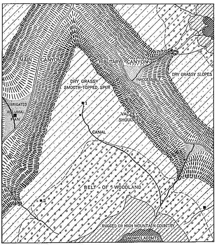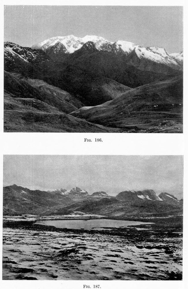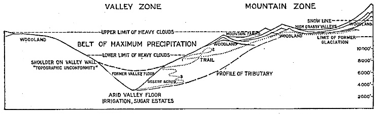 [9] Reference to the figures in this chapter will show great variation in the level of the timber line depending upon insolation as controlled by slope exposure and upon moisture directly as controlled largely by exposure to winds. In some places these controls counteract each other; in other places they promote each other’s effects. The topographic and climatic cross-sections and regional diagrams elsewhere in this book also emphasize the patchiness of much of the woodland and scrub, some noteworthy examples occurring in the chapter on the Eastern Andes. Two of the most remarkable cases are the patch of woodland at 14,500 feet (4,420 m.) just under the hanging glacier of Soiroccocha, and the other the quenigo scrub on the lava plateau above Chuquibamba at 13,000 feet (3,960 m.). The strong compression of climatic zones in the Urubamba Valley below Santa Ana brings into sharp contrast the grassy ridge slopes facing the sun and the forested slopes that have a high proportion of shade. 54 represents the general distribution but the details are far more complicated. See also Figs. 53A and 53B. (See Coropuna Quadrangle.)