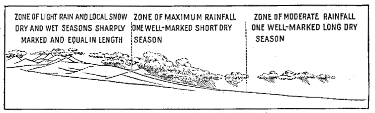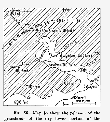 [25] A dry pocket in the Huallaga basin between 6° and 7° S. is described by Spruce (Notes of a Botanist on the Amazon and Andes, 2 vols., London, 1908). Tarapoto at an elevation of 1,500 feet above sea level, encircled by hills rising 2,000 to 3,000 feet higher, rarely experiences heavy rain though rain falls frequently on the hills.