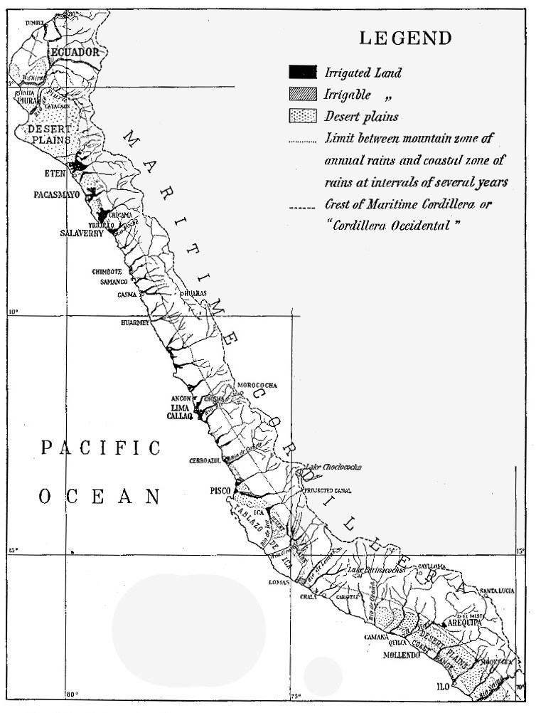 Capital was lacking but there was also lacking energy among the people. Slipshod methods brought them a bare living and they were too easily contented. Their standards of life should be elevated. Education was still for the few, and it should be universal. A new spirit of progress was slowly developing—a more general interest in public affairs, a desire to advance with the more progressive nations of South America,—and when it had reached its culmination there would be no happier land than coastal Peru, already the seat of the densest populations and the most highly cultivated fields.