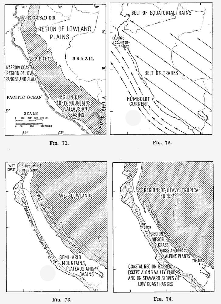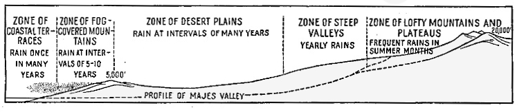 These four men have portrayed the four great regions of Peru—the lowland plains, the eastern mountain valleys, the lofty plateaus, and the valley oases of the coast. This is not all of Peru. The mountain basins have their own peculiar qualities and the valley heads of the coastal zone are unlike the lower valleys and the plateau on either hand. Yet the chief characteristics of the country are set forth with reasonable fidelity in these individual accounts. Moreover the spirit of the Peruvians is better shown thereby than their material resources. If this is not Peru, it is what the Peruvians think is Peru, and to a high degree a man’s country is what he thinks it is—at least it is little more to him.