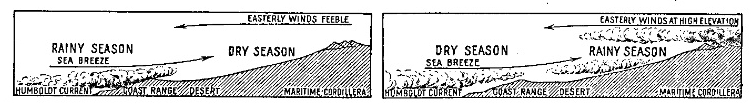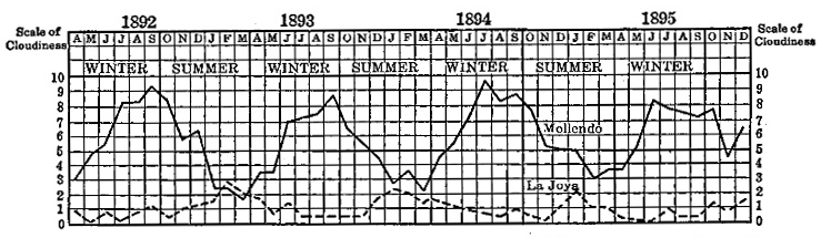 [23] According to Ward’s observations the base of the cloud belt averages between 2,000 and 3,000 feet above sea level (Climatic Notes Made During a Voyage Around South America, Journ. of School Geogr., Vol. 2, 1898). On the south Peruvian coast, specifically at Mollendo, Middendorf found the cloud belt beginning about 1,000 feet and extending upwards to elevations of 3,000 to 4,000 feet. At Lima the clouds descend to lower levels (El Clima de Lima, Bol. Soc. Geogr. de Lima, Vol. 15, 1904). In the third edition of his Süd und Mittelamerika (Leipzig and Vienna, 1914) Sievers says that at Lima in the winter the cloud on the coast does not exceed an elevation of 450 m. (1,500 feet) while on the hills it lies at elevations between 300 and 700 m. (1,000 and 2,300 feet).