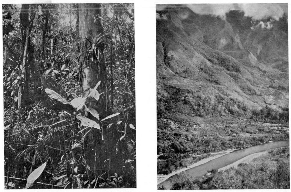 Fig. 1—Tropical vegetation, clearing on the river bank and rubber station at Pongo de Mainique. The pronounced scarp on the northeastern border of the Andes is seen in the right background.