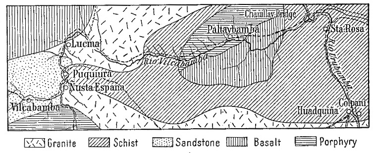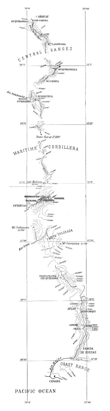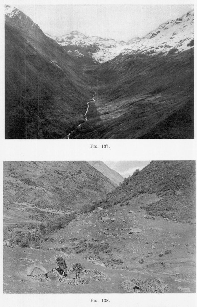 [15] Marcoy who traveled in Peru in the middle of the last century was greatly impressed by the sympathetic changes of aspect and topography and vegetation in the eastern valleys. He thus describes a sudden change of scene in the Occobamba valley: “... the trees had disappeared, the birds had taken wing, and great sandy spaces, covered with the latest deposits of the river, alternated with stretches of yellow grass and masses of rock half-buried in the ground.” (Travels in South America, translated by Elihu Rich, 2 vols. New York, 1875, Vol. 1, p. 326.)