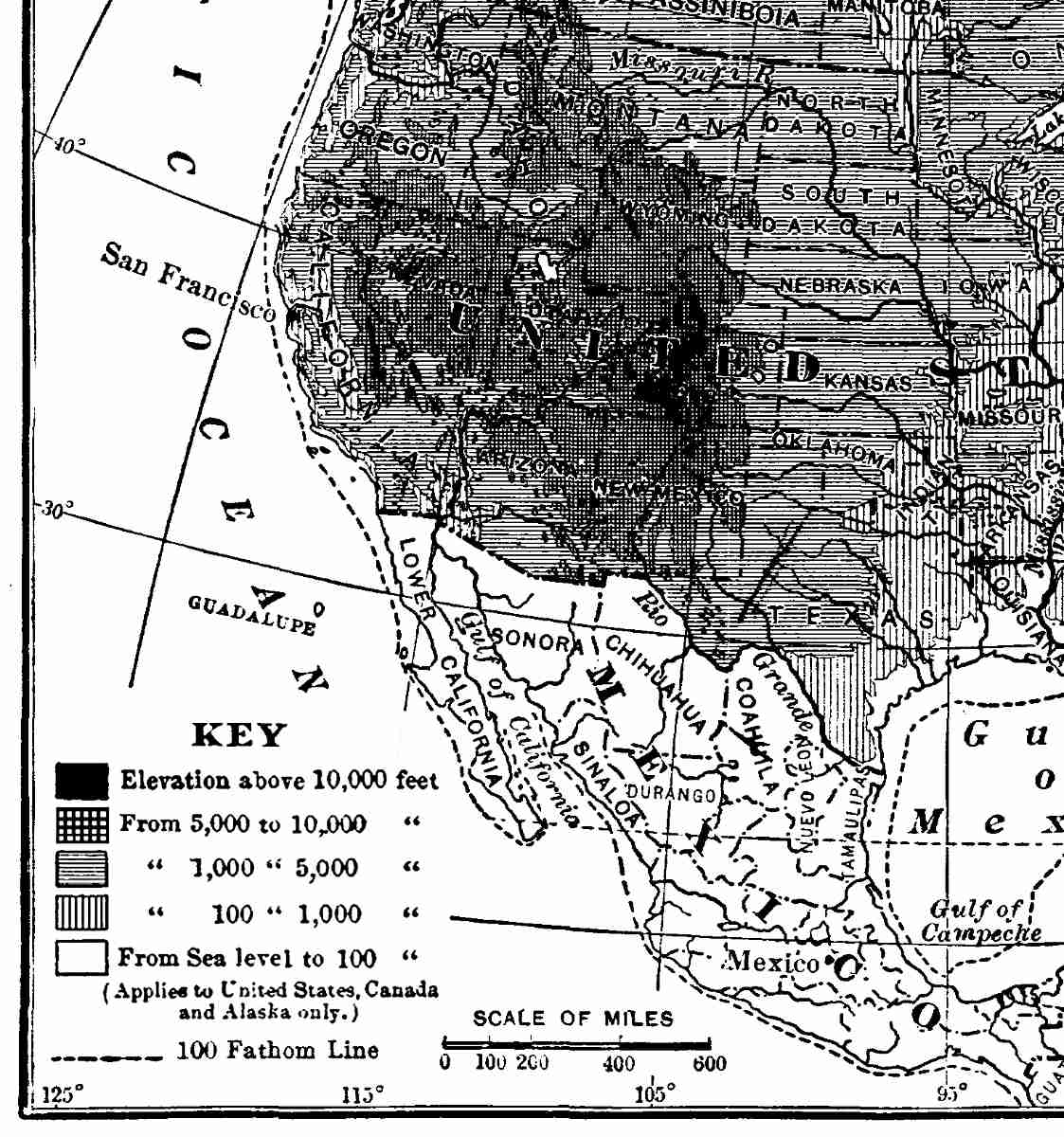 Fig. 1.—North America.From a photograph of a relief map by Victor and Cosmos Mindeleff. Scales of original: Horizontal, 120 miles to 1 inch; vertical, 40,000 feet to 1 inch: proportion, 1:16.