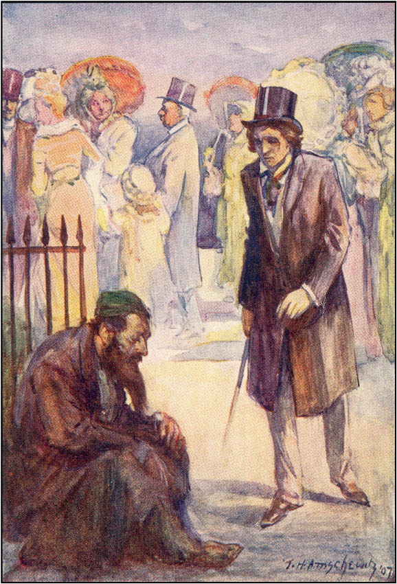 I stood, pretending to watch the gay parasols, but furtively studying my Jew. Yes, in that odd figure, so strangely seated on the pavement, I had chanced on the very features, the haunting sadness and mystery of which I had been so long in quest. I wondered at the simplicity with which he was able to maintain a pose so essentially undignified. I told myself I beheld the East squatted broodingly as on a divan, while the West paraded with parasol and Prayer-Book. I wondered that the beadles were unobservant of him. Were they content with his abstention from the holy ground [7]of the Church Parade, and the less sacred seats on the promenade without, or would they, if their eyes drew towards him, move him on from further profaning those frigidly respectable windows and stuccoed portals?