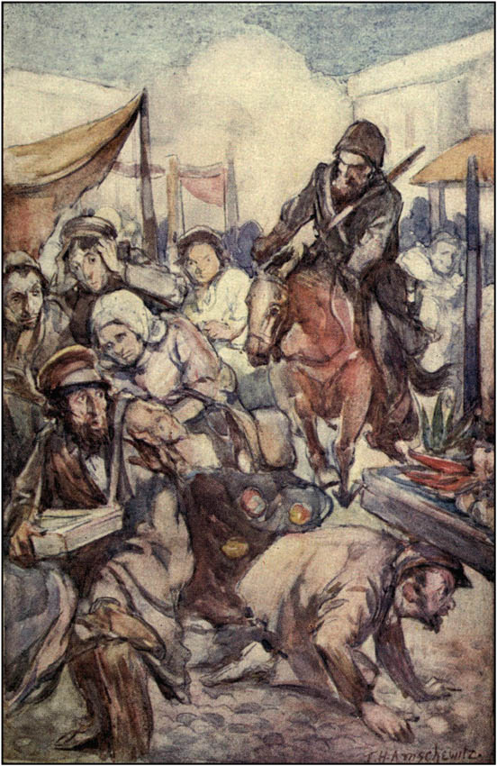 The white-faced landlord, wringing his hands and saying his Vidui (death-bed confession), offered him [424]and his violin-case a place in the cellar, but he preferred to climb to the roof, from which with the aid of a small glass, he had a clear view of the cordon drawn round the doomed quarter. A ricocheting cannon-ball crashed through the chimney-pots at his side, but he did not budge. His eyes were glued upon a figure he had espied amid the cannon.
