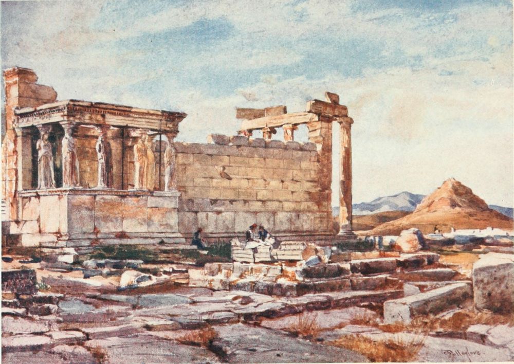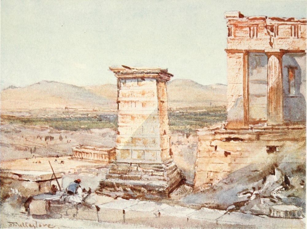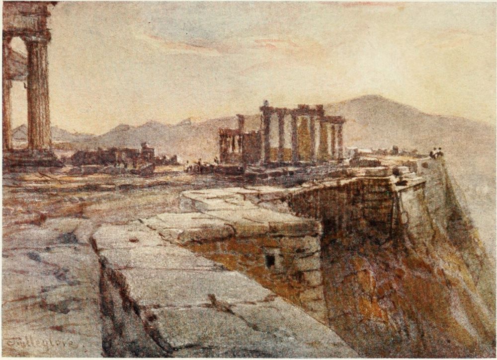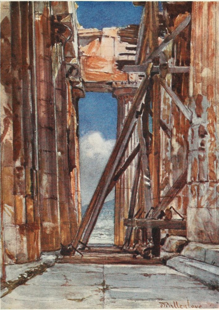 The pale golden light on the architraves within the Posticum is reflected from the east side of the west front of the Temple. The scarped rock to the right is the boundary of the precinct of Artemis Brauronia. The drum of a column in the right-hand corner of the drawing represents the southernmost column of the eastern portico of the Propylæa. For obvious artistic reasons the whole column could not be included in the drawing. The pedestal before the column is that of the statue of Athene Hygieia by the sculptor Pyrrhos. Two or three paces in front of it are the remains of a large free-standing altar.