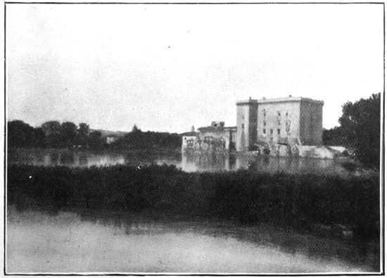 The view from the bridge as one crosses to Tarascon is as pleasant a picture as may be seen in any part of old France. The noble stream, broken by sedgy inlands, sweeps on between its low banks, and rising sheer from the water's edge on a firm rock-base, almost opposite the picturesque mass of Bellicardo, 185 are the massive walls of the ancient castle of Tarascon, founded by Count Louis II. in the fourteenth century and finished by King Réné of Anjou in the fifteenth, and at one time tenanted by Pope Urbain II., but now, like many another palace of kings, fallen to the condition of a common prison. Within these grim walls Tartarin passed some of his inglorious days, but days not lacking romance, for was not Bompard from the opposite height signalling o' nights to him by means of mysterious lights?