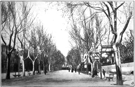 Proceeding straight into the town, we arrive in a minute or so at the Promenade, with its long rows of plane trees, as in most French towns, only in Tarascon the trees seem to 186 grow higher and leafier than anywhere else. It opens out a short distance from the riverside, and although it cannot be strictly called the "Walk Round" for the reason which the author gives—that it encircles the town—it certainly traverses a goodly portion of Tarascon, and takes in en route that "bit of a square" to which he makes so many sly allusions.