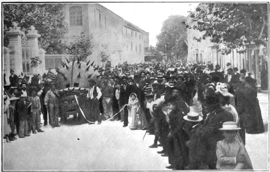 The approach of the Host is heralded by the acolytes in their scarlet gowns with lace tunicles, who come singing, and precede the white-robed members of the choir, lay brethren and priests, who are either diligently reading from books, or mumbling unintelligently the orisons provided for the occasion. Succeeding these come more acolytes, swinging censers, and others who, walking backwards, bear large baskets of rose leaves, and scatter their fragrant burdens in handfuls on the road in front of the bishop. The latter, arrayed in his most gorgeous vestments, advances slowly, holding aloft, with well-assumed solemnity, to impress beholders with the awful sacredness of his charge, the elaborate brass monstrance or cabinet which encloses the consecrated wafer. The bishop, who thus displays before the just and the unjust the Holy Sacrament, walks under a canopy of richly embroidered 204 cloth, carried on four posts by specially chosen members of some of the brotherhoods, or perhaps by some unusually devout laymen, whose purses have not been altogether closed when the clerical hat has gone round.