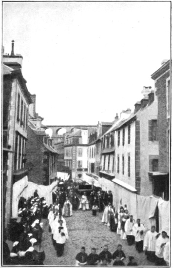 For centuries the 19th of June has been to the people of France a day of high festival. No one who has happened to be travelling in Normandy or Brittany—or indeed in almost any of the French provinces—about this time of the year can have failed to notice the celebration of the Fête Dieu, and many may have wondered what it was all about. It has existed so long as one of the national customs, varying in its observance in different parts of the country, and having passed through many periods of change, that a few years ago he would have been accounted a rash and uninspired prophet who would have foretold that the Republican Government might have the temerity to lay its embargo on this sacred institution. But, behold the day when the secular hand of M. Combes had stretched out into the remotest parts of fair France, and following hard upon 196 the upsetting of monastic peace, came the prohibition of religious processions in public. The effect of this order was to limit the fête in many places to a mere perambulation of the exterior of the church, and in others the procession was confined entirely to the interior, though here and there, it would seem, the function took place just as it did generations before M. Combes and the anti-clericals arose into power.
