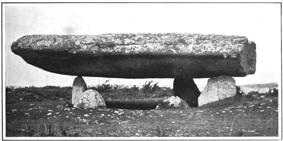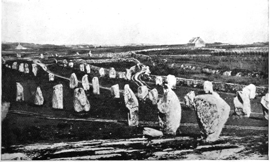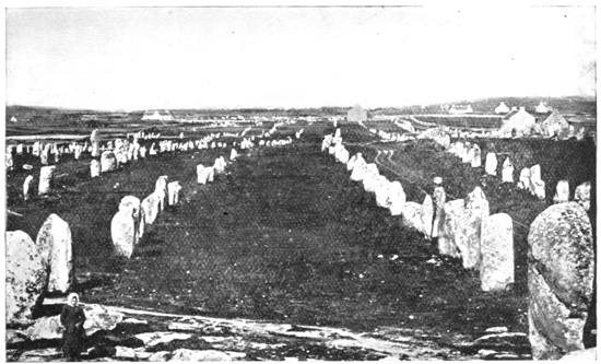 But my story must not end here, although we take our leave of James Miln and his museum. It is almost impossible to describe in any adequate way the historic value of this part of Brittany. Stonehenge, in England, is a national monument which we zealously treasure, yet its value, compared with the neolithic remains of Morbihan, is as a drop in a bucket of water. In the region to the east and north of Carnac druidical remains are as plentiful as blackberries in an autumn hedge. The sight of what are known as "les alignements de Carnac" is one never to be forgotten. Standing on the little mound by the chapel of Saint Michael already mentioned, and looking northward across the plain, we see an enormous range of menhirs or druidical stones standing like an army at attention. There are no fewer than 2,813 of these massive stones to be seen from this point, and the imagination is busy at once striving to picture the strange rites practised here by unknown people before the dawn of history. Dotted all over the vast plains are dolmens and cromlechs of varying size. 216