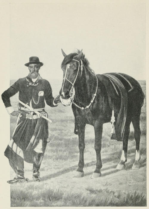 A “Gaucho” in full costume, wearing the “chiripá,” or loose over-trousers, and carrying the “bolas” around his waist.