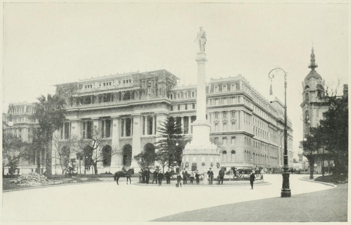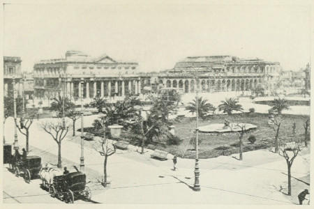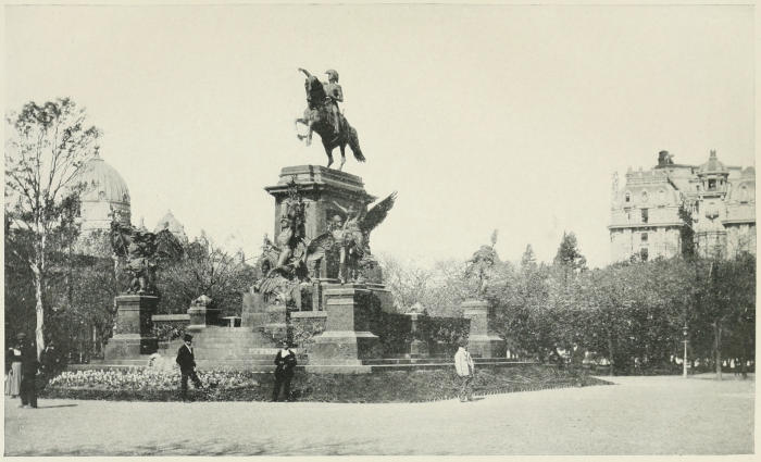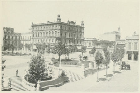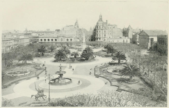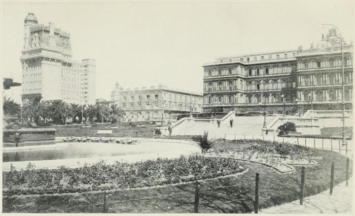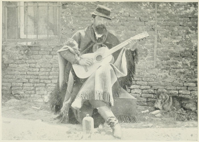 On the whole, you will see we had not so bad a time in the capital of Uruguay. Memories of our pleasant days and nights there crowd so thickly on me as I write that it is difficult to set them down, and I feel that the most I can do is to touch in the briefest way upon those that come uppermost, leaving it to the reader to imagine how our time was passed. We never seemed to tire of wandering the streets, as the avenida and the two central plazas retained an air of brightness and friendliness to a late hour, and often a military band would be playing between nine and eleven o’clock at night. Until a late hour, the town never assumed the extraordinary nightly dulness of Buenos Ayres, and very pleasant it was, night after night, to see the little family groups meet and gossip with the familiarity of a village. The Bohemian element, represented here, as elsewhere, by wide-awake hats and pendulous locks, had its habitat at the Café Giralda, at the corner of the Plaza Independencia, where most evenings the local poets—it rivals Paisley as a nest of singing birds—journalists, and “coming men” in politics, looked in for a coffee and a chat.