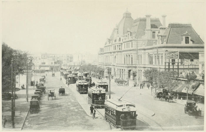 The greatest scandal of all is that laid at the door of President Batlle y Ordoñez, and may yet assume the importance of an international dispute. During the presidency of his predecessor, an international syndicate, in which I believe both French and English shareholders invested several millions of money, was granted a concession to carry out a huge enterprise, which would so vastly enhance the appearance of the town and add to its wealth that, once effected, not even Rio de Janeiro could be cited as a finer example of a modernised city. At the present time, the poorest part of Montevideo is that lying along the southern margin of the promontory, eastward towards the suburb of Ramírez. It[422] has a rocky fore-shore, and the water there is comparatively shallow, so that it would be possible to reclaim a considerable amount of land along this side of the town, and build a magnificent marine drive, extending all the way from the oldest part of the city to the suburb mentioned, and thence linking up with the fine promenade at Pocitos. Many maps of the city are now in circulation with this improvement shown as though it actually existed, the great highway by the waterside being marked as “Rambla Sud América.”