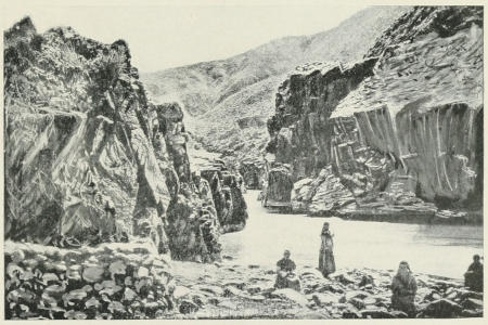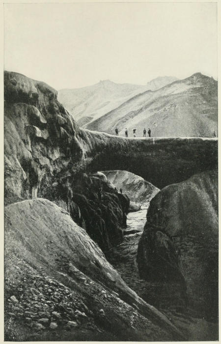 As we approach Punta de las Vacas, a few miles beyond Zanjon Amarillo, the ascent suddenly stiffens, and the railway now performs the characteristic corkscrew journey of all Alpine lines. This station is at the junction of the Cow River (Rio de las Vacas) with the Mendoza, but whence the name of the former I cannot guess, for it seemed a region where vacas would fare badly. Southward we had now a view of the volcano Tupungato, but when we had laboriously[451] climbed another twelve or thirteen miles to Puente del Inca, we were just in time to see, away to the north, the summit of Aconcagua, the monarch of the Andes, being blotted out in a snow-storm, which in a few minutes more was upon us, quickly filling the empty barrows about the station with whitest flakes and enticing most of the passengers to engage in the primitive pastime of snow-balling. At this point, 9,000 feet above sea level, where there is quite a good hotel, with thermal baths that attract many visitors in the summer time, we find one of the few curiosities of the route, a natural bridge of volcanic matter, over the stream, but I imagine he was a lonely Inca who gave his name to it, as this is surely the farthest limit to which Inca civilisation reached southward from Peru and Bolivia.