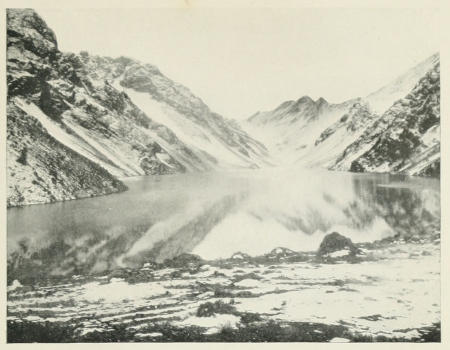 When we emerged on the other side and immediately began to descend, we had bid good-bye to Argentina, and one of the strangest and most moving scenes I have ever witnessed presented itself. We came out upon a colossal amphitheatre, from which, to the northwest, the mountain swept down from the Inca’s Lake—seen dimly through the driving sleet and snow on our right—into a white mysterious abyss some two thousand feet below, where dark objects such as the rocky shoulders of lower hills, seemed to be floating in an eerie sea of vapour. The snow storm had lessened and was turning now to rain, but the scene was awesome in its effect upon the observer descending these uncanny slopes into this vague new land.