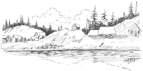 Sand Point station contains a store with warehouses, and customs house and such other buildings as are usually found in a frontier trading post. There is also a large hotel which was built during the administration of Mr. O’Bryon as factor for Lynde & Hough. O’Bryon has since been lost in the schooner Mary Brown which was wrecked off Queen Charlotte island on her passage down last fall. The hotel is probably the finest building in Alaska. It is furnished with many of the modern improvements, and helps to give the place the appearance of one of those boom towns that used to be seen on Puget Sound a few years ago. No one to-day knows why the hotel was built, not even the company. It is thought that O’Bryon intended establishing a pleasure resort for tourists who would go there to fish and hunt during their summer vacations. In front of the station lies the hull of the old three-masted schooner John Hancock, which was wrecked there several years ago.