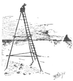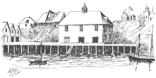 The Hancock has quite an interesting history. The gunboat John Hancock was built at Charleston, S. C., in 1846. She was then a side-wheel steamer. After the Mexican war she was transferred to the Pacific coast. She was Commodore Perry’s flagship when he negotiated his famous treaty with the emperor of Japan. In later times the Hancock was purchased by Lynde & Hough, of San Francisco, and transformed into a three-masted schooner for the Alaskan trade. Her model was suited for swift sailing, having been very long and slender. She made the quickest passage ever made by a sailing vessel on that route. After she drifted ashore the wreck was filled with rock and a wharf was built out over it.