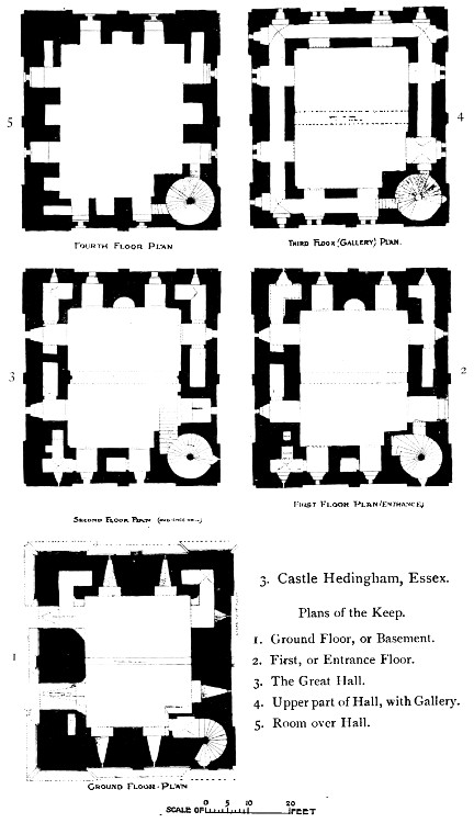 The great keep at Castle Hedingham is a fine specimen of the work of the twelfth century. Its exact date has not been ascertained, but its arrangement and its architectural detail point to the same date as Rochester Castle (about 1130), and good authorities go so far as to suggest that the same designer was employed on both. It has all the characteristics of an early keep; a vast, plain mass of masonry, slightly broken by the long vertical lines of shallow buttresses and angle turrets, and pierced at each floor with small windows—smallest near the ground where most accessible (Fig. 2). The entrance, as at Peak Castle, and all early keeps, is some feet above the ground, and in this case is approached by a flight of steps; it leads into the first floor, below which at the ground level, or thereabouts, is the cellar or store-room, approached only from the room above it. The plan is quite simple (Fig. 3), consisting of a large room (38 by 31 ft.) on each floor, enclosed by thick walls which are honeycombed with mural chambers and recesses. Some of these chambers are garde-robes, others were no doubt used as sleeping places by the family and principal guests. Over the entrance floor were two others; first the hall, a room with two tiers of windows, the upper of which gave on to a gallery or triforium which made the circuit of the building in the thickness of the wall: above the hall another room very similar to that on the entrance floor.