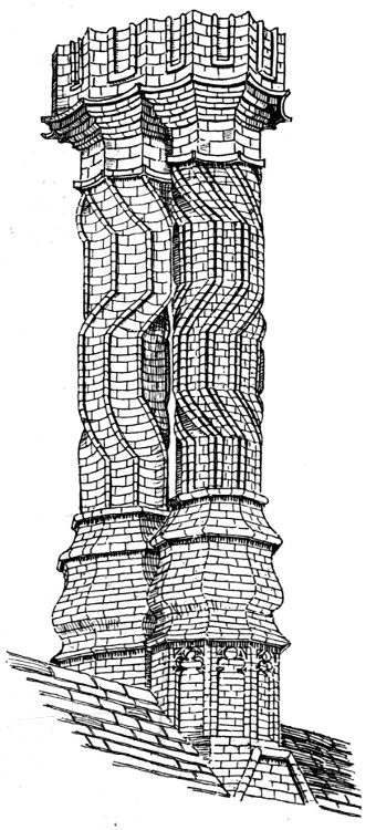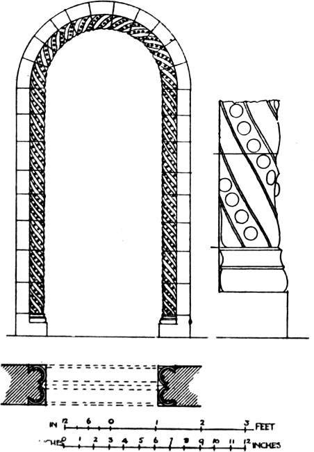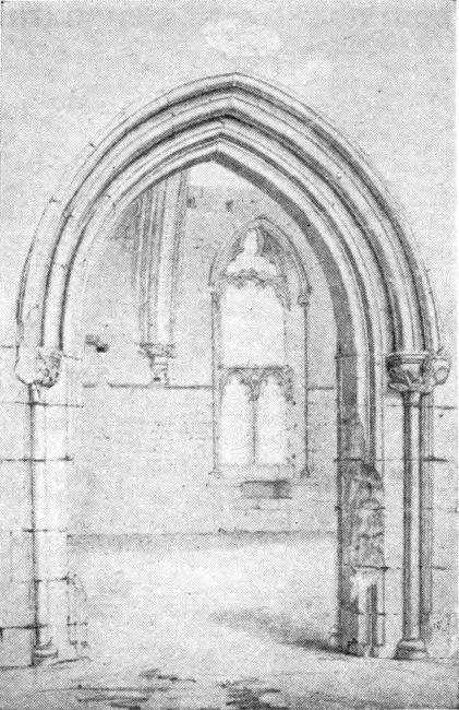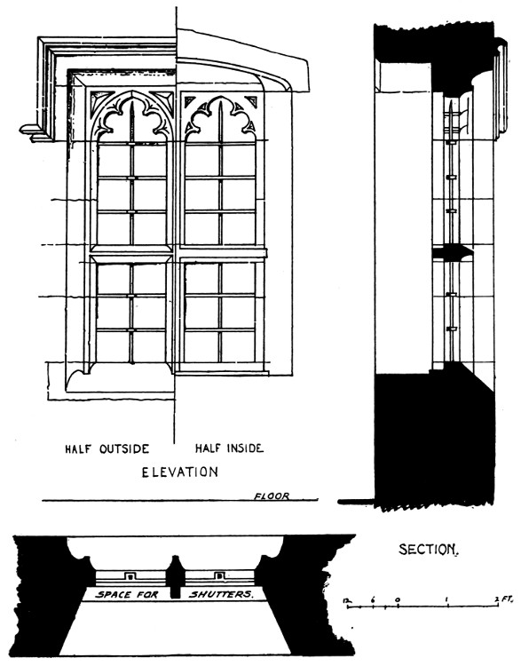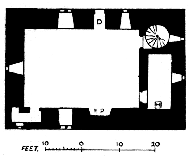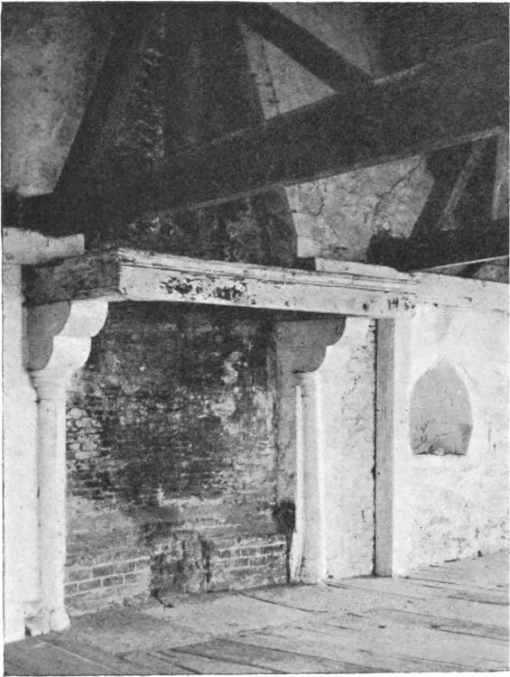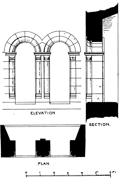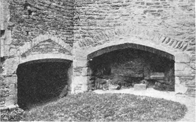 The fireplaces had not a flue such as we understand it, that is a long shaft running up the whole height of the building and crowned by a chimney; instead of this they had a short funnel contrived in the wall, and leading almost directly to small vertical openings in the face of the wall, cleverly concealed in the angle of a buttress (Fig. 6). The fireplaces, moreover, were mere recesses in the wall surmounted by round arches; there was no attempt at a projecting hood or any such ornamental feature as we are accustomed to think of as a chimney-piece. These things were to come later. They were, however, of generous size, as indeed they[13] might well be, for it must be remembered that the windows were not glazed, and although they were too small to make the place cheerful, they were quite large enough to make it cold, and as each side of the room had an outside wall, the wind, from whatever quarter it blew, would find its way in. It is true that there were wooden shutters to the windows, which could be shut at night, but in spite of this there was every inducement to maintain a large fire; the volume of the flame may have overcome the disadvantage of the short flue, but the smoke must have had difficulty in escaping through the small vents, and doubtless much of it eventually found its way out through the open windows.